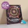 Artwork examples from the 12,026 Human Era Calendar featuring the calendar grid.Close up of the shiny foil cover of the 12,026 Human Era Calendar 12,026 Human Era Calendar with a cosmic landscape design held by hands on a white surface.Calendar with a colorful illustration of astronomer characters, for the month of August.Colorful abstract artwork for the 12,026 Human Era Calendar featuring an astronaut, with swirling patterns and celestial elements.Complimentary postcard featuring Lurchie looking up at the stars.