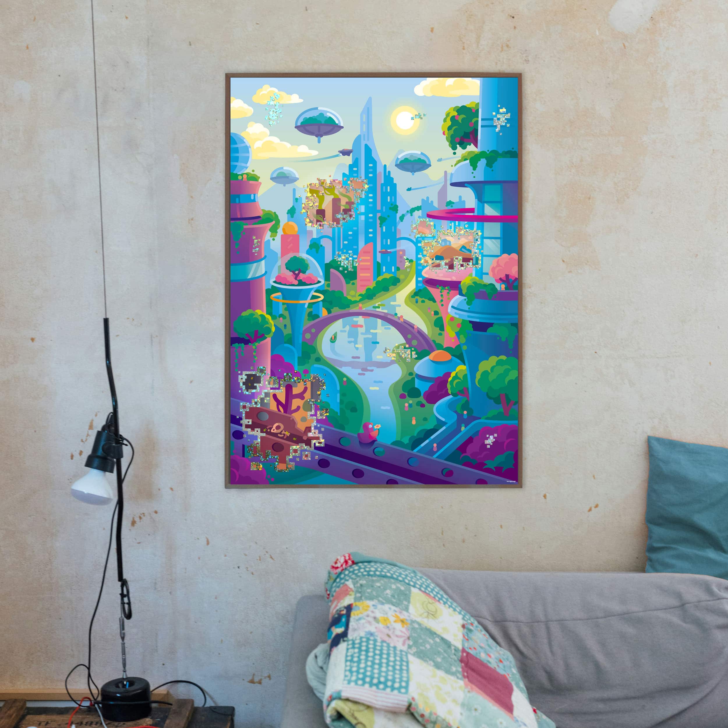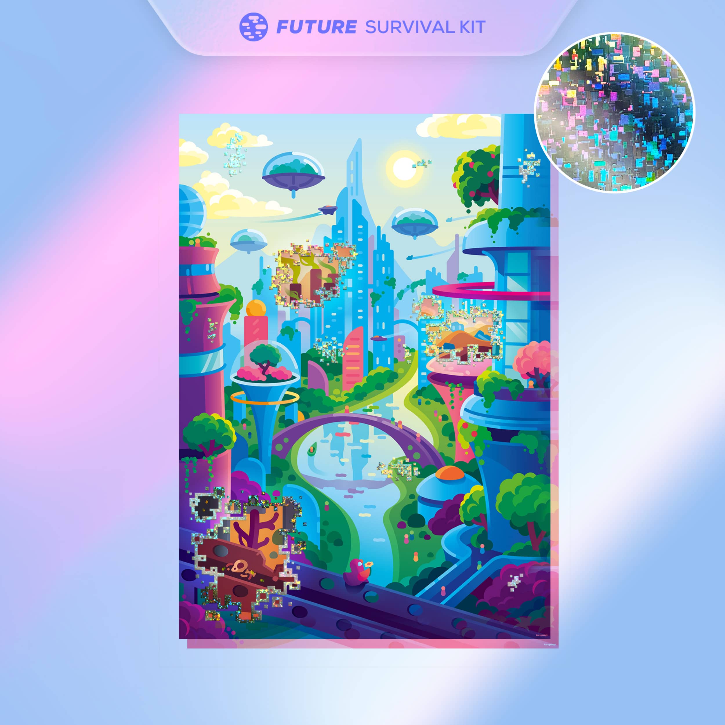 Our scientist birbs peeked through the time veil and discovered a utopia! But there seems to be more than meets the eye... Hang this print as a chilling (yet sparkly!) prophecy of the future.