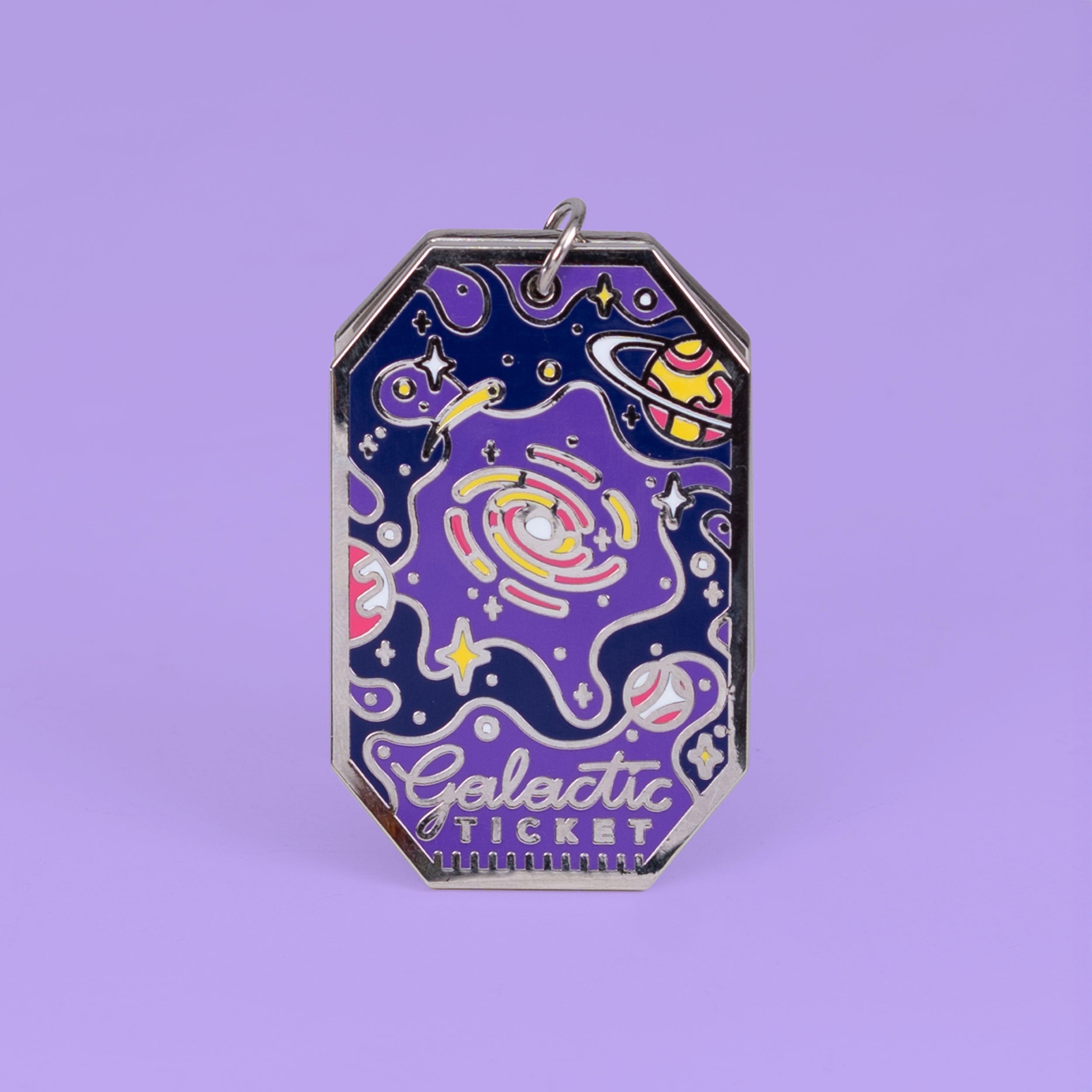 This unique keychain features two stunning hard enamel charms – a Traveller Pass with cutout details revealing the Galactic Ticket beneath.