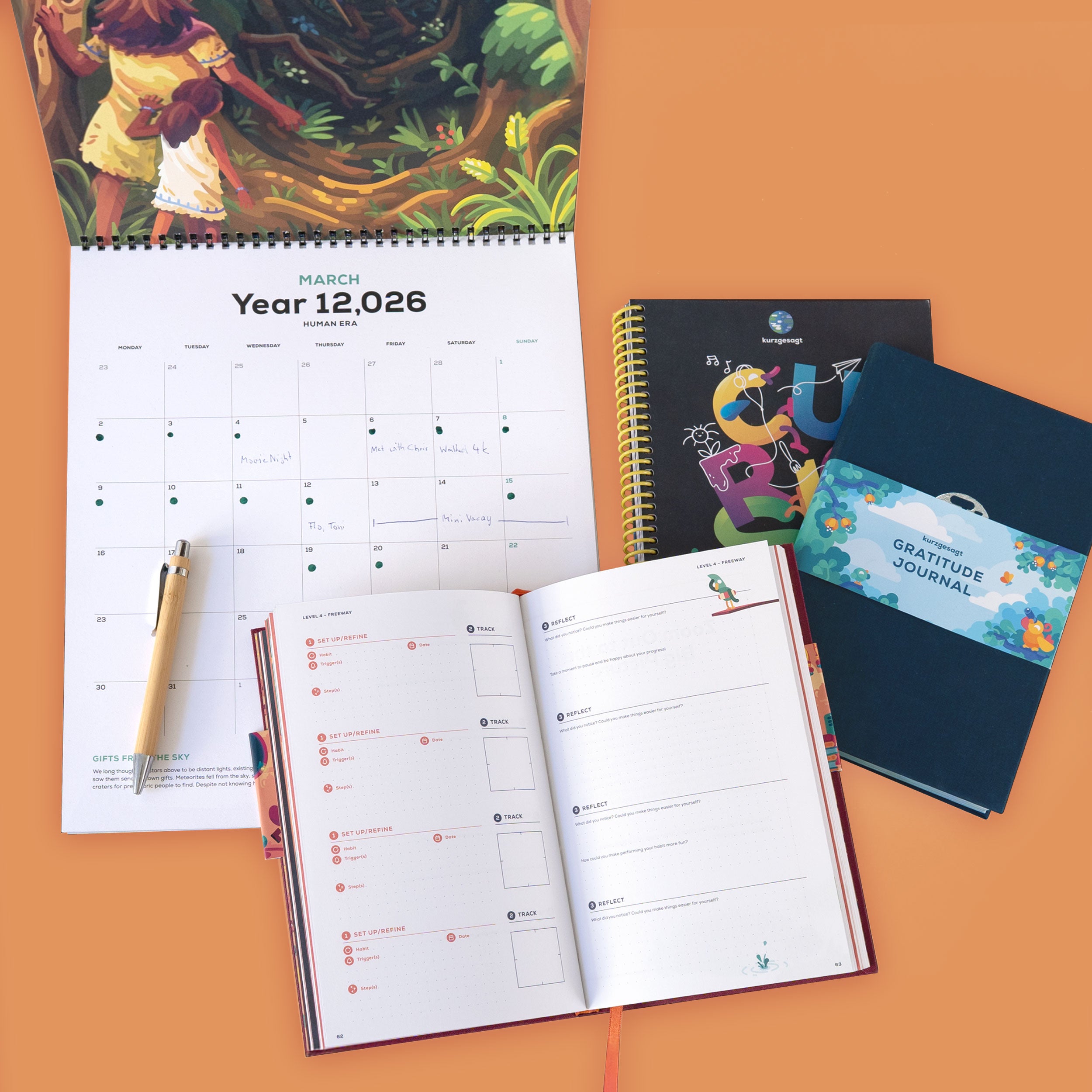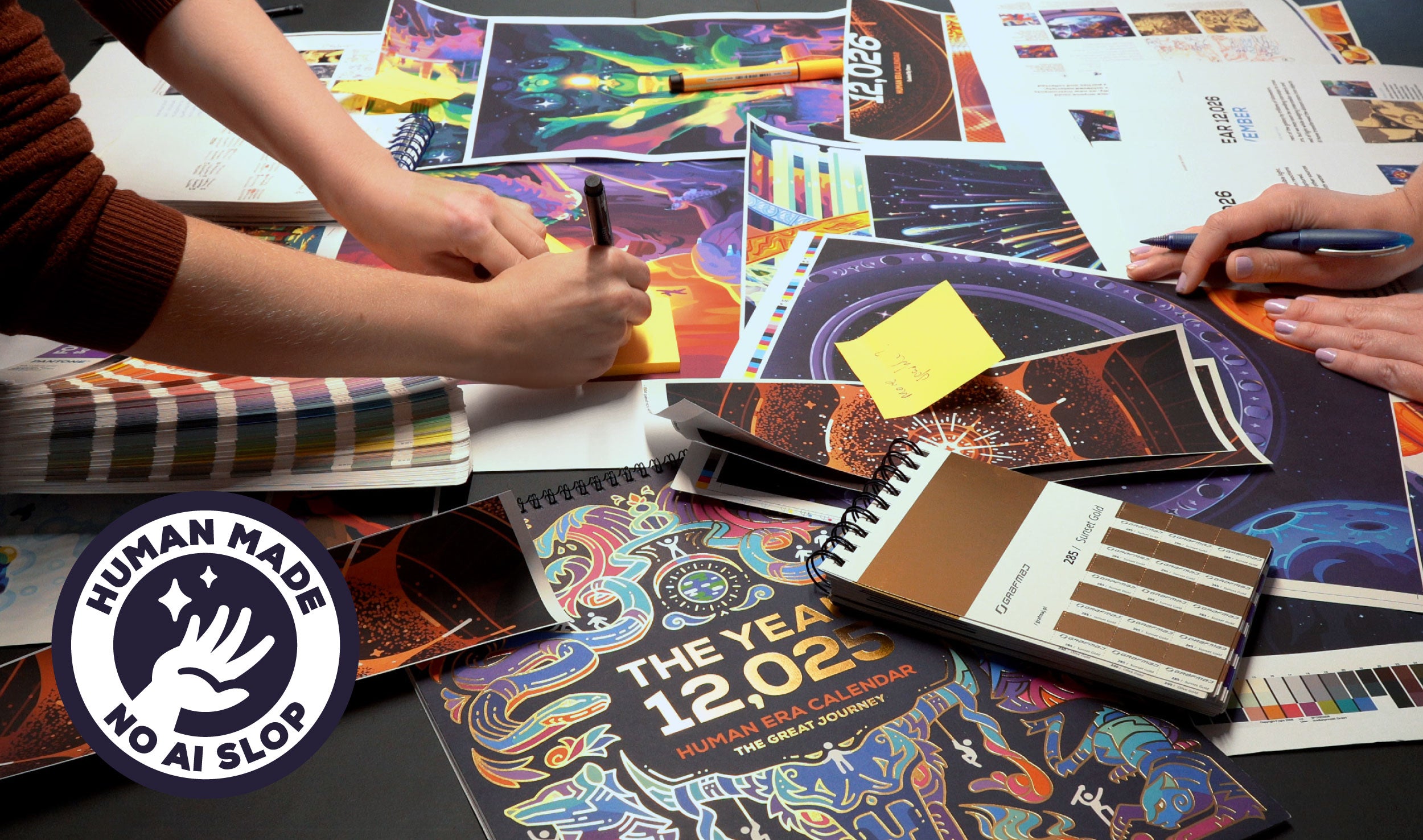 Every page of the Human Era Calendar is researched, written, illustrated, and designed by the real people at kurzgesagt. We don't use AI, just curious minds and careful hands. From first sketch to final print, it's a product of time, love, and incredible human effort.