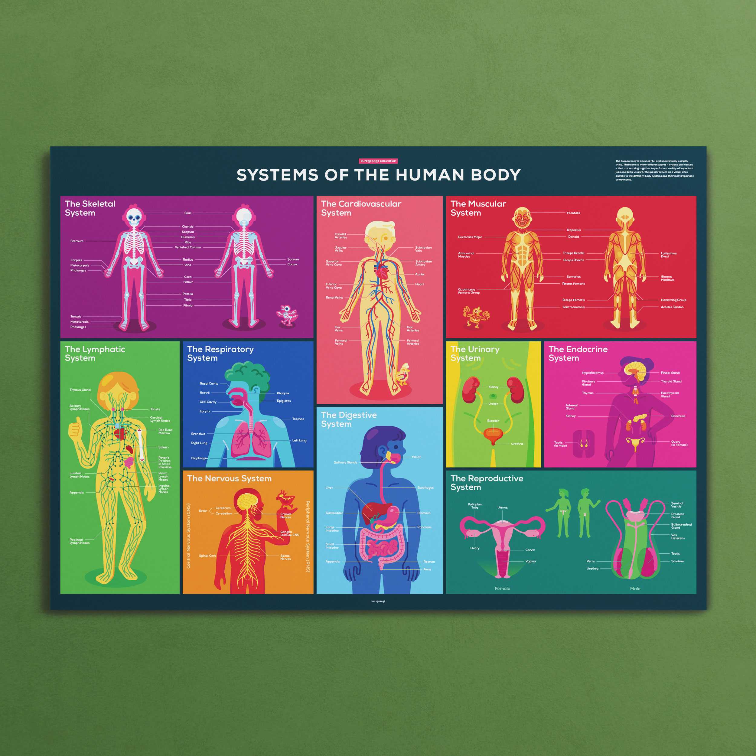 This poster of the human body is a visual introduction to the different body systems and their most important components.