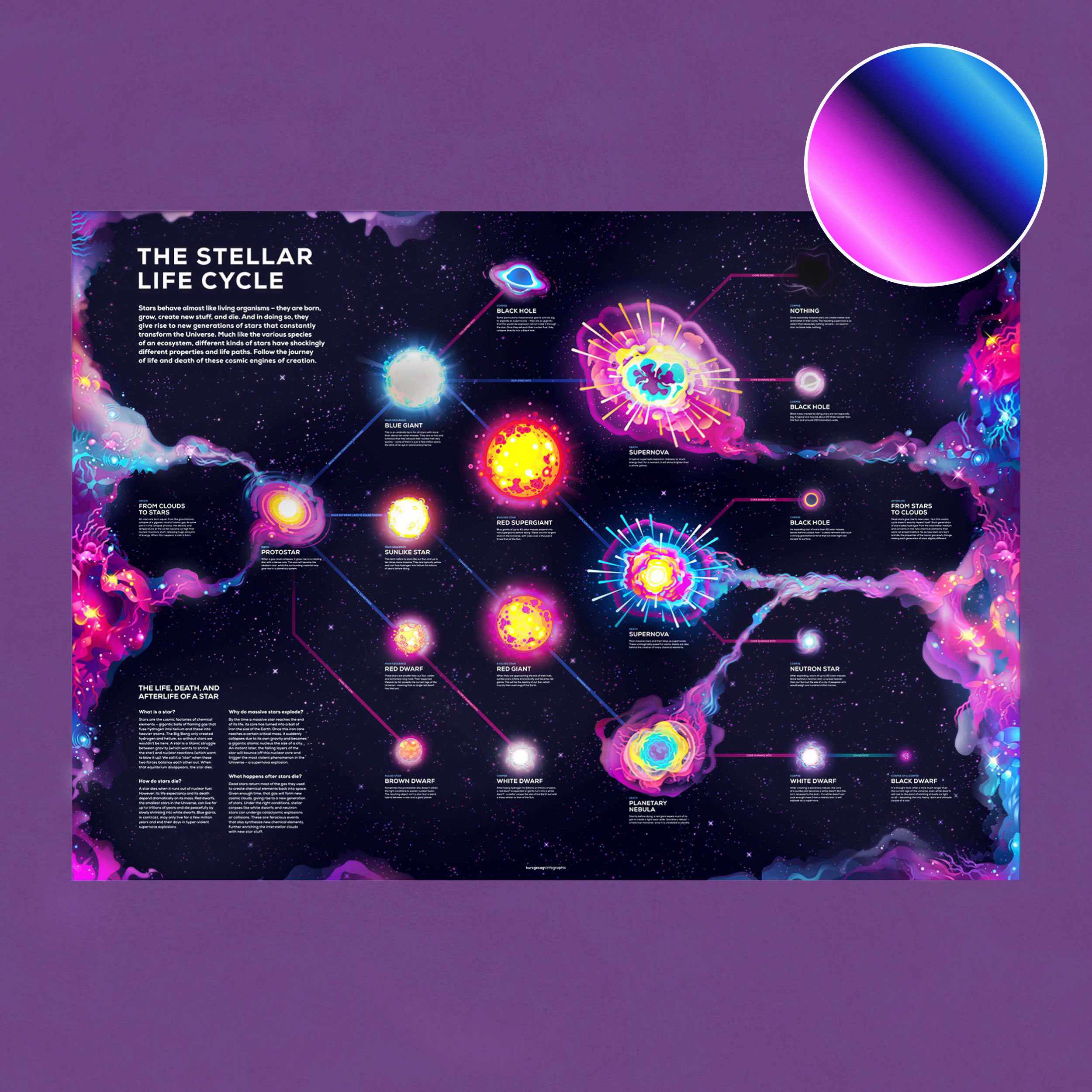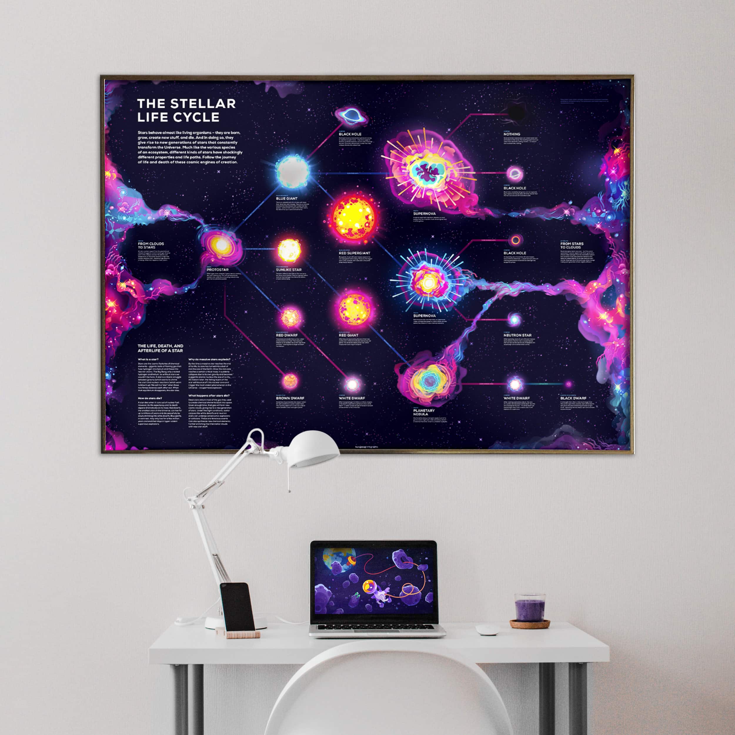 Each celestial wonder, from dense protostars to colossal supernovae, shines with all the colors of the universe on thick, high-quality paper. This poster easily becomes the star of any wall it hangs upon.