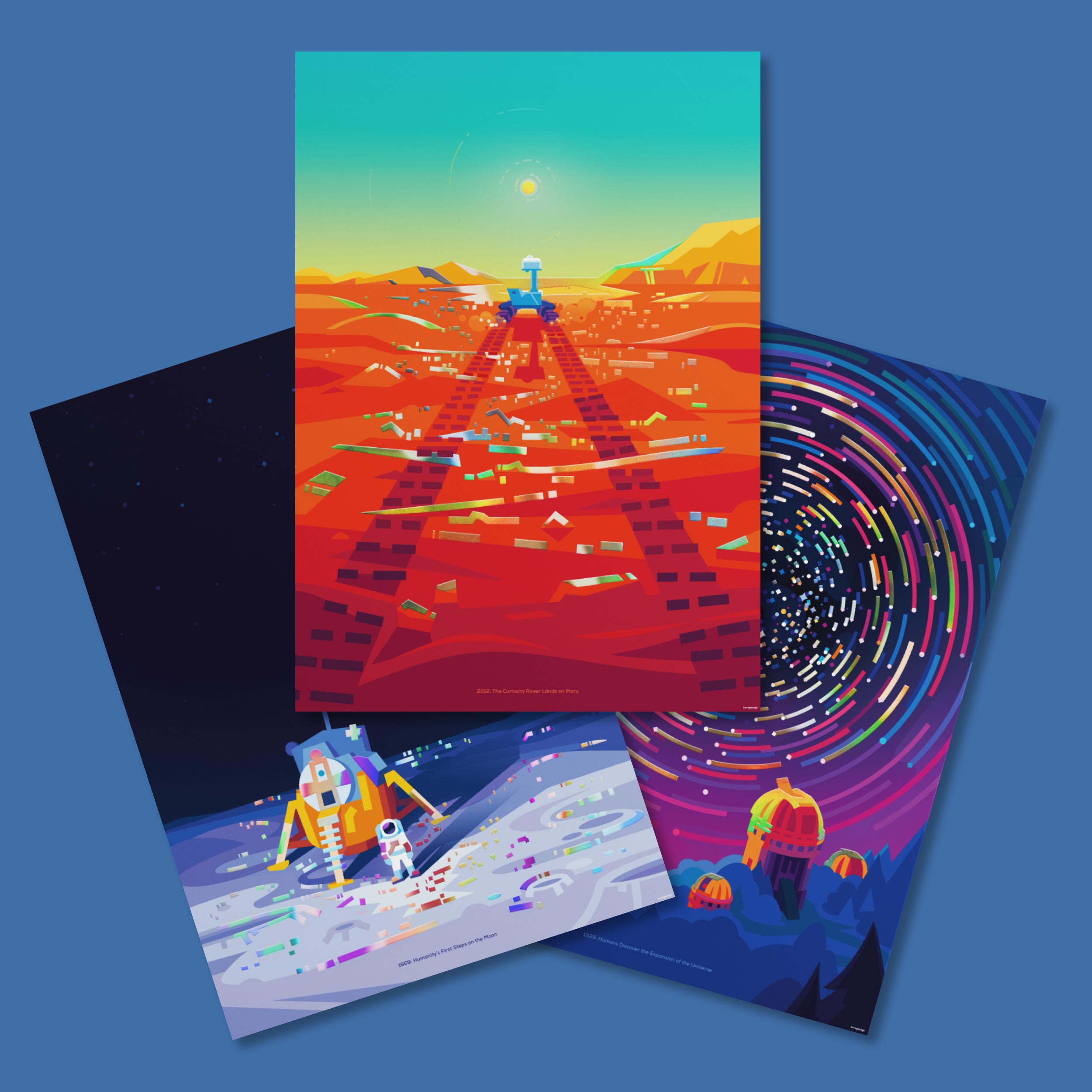 Printed on thick, premium paper with shimmering foil accents, each poster captures a different chapter of space exploration. Hang them side by side for a powerful tribute to our journey through the cosmos.