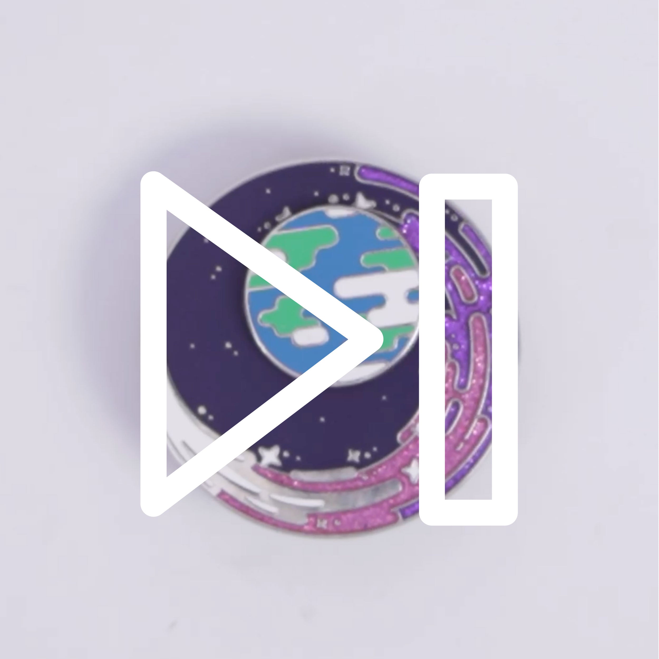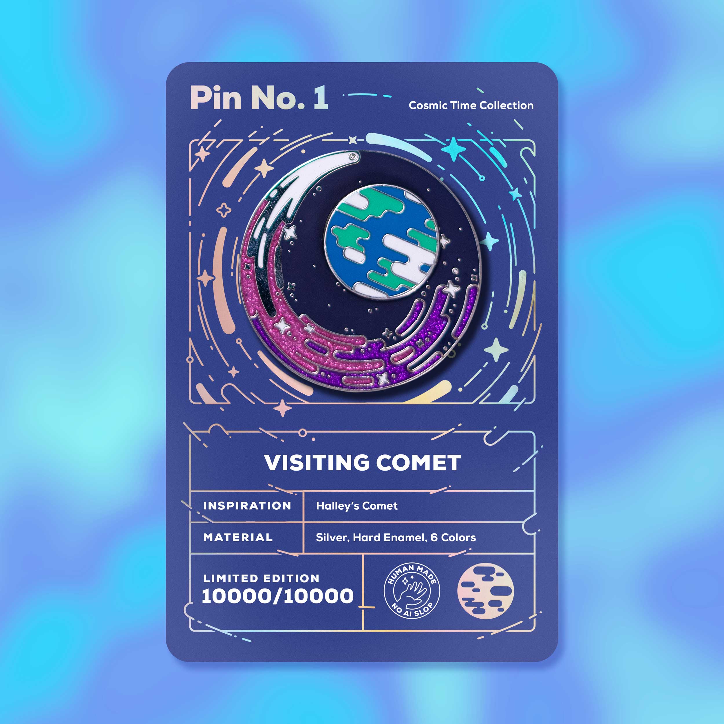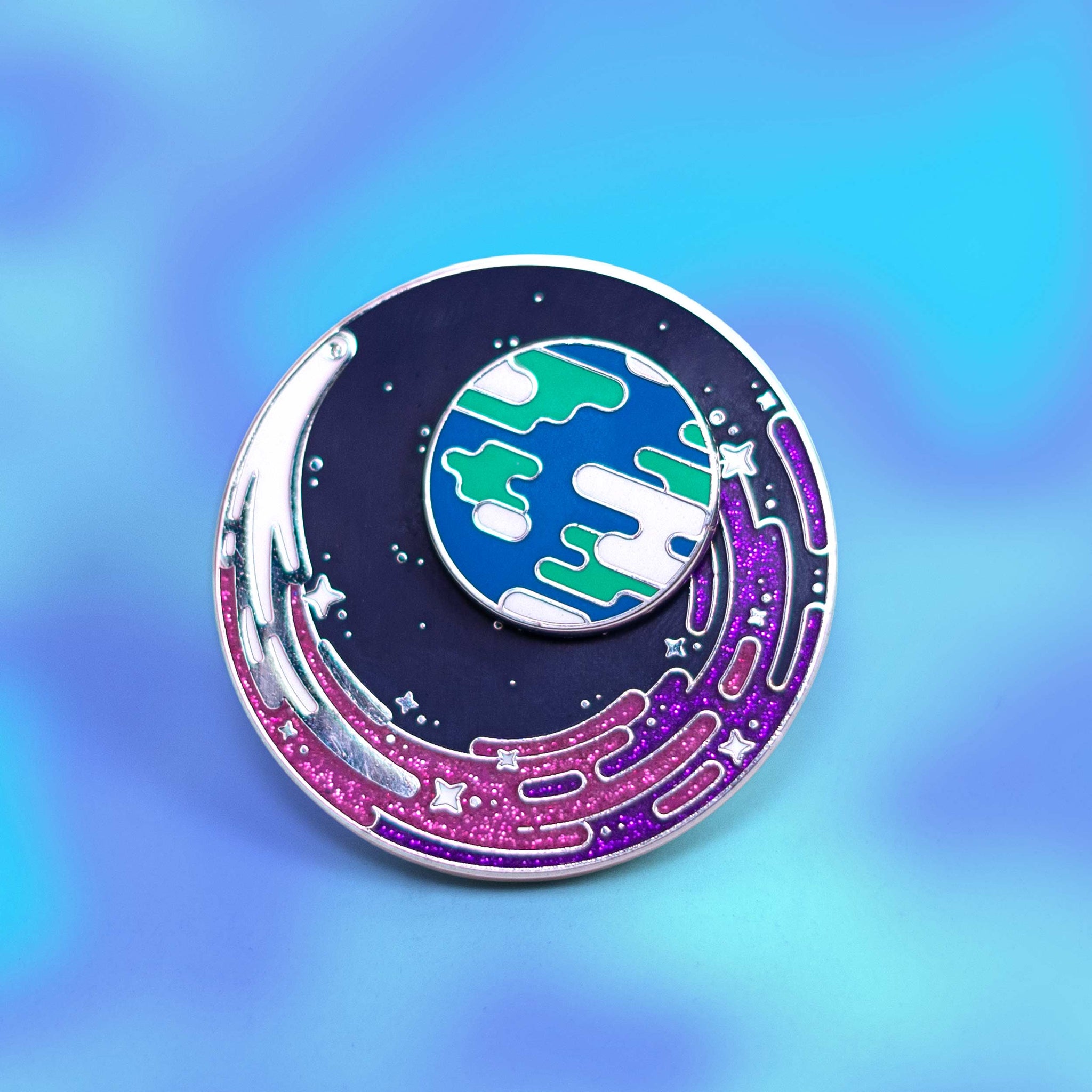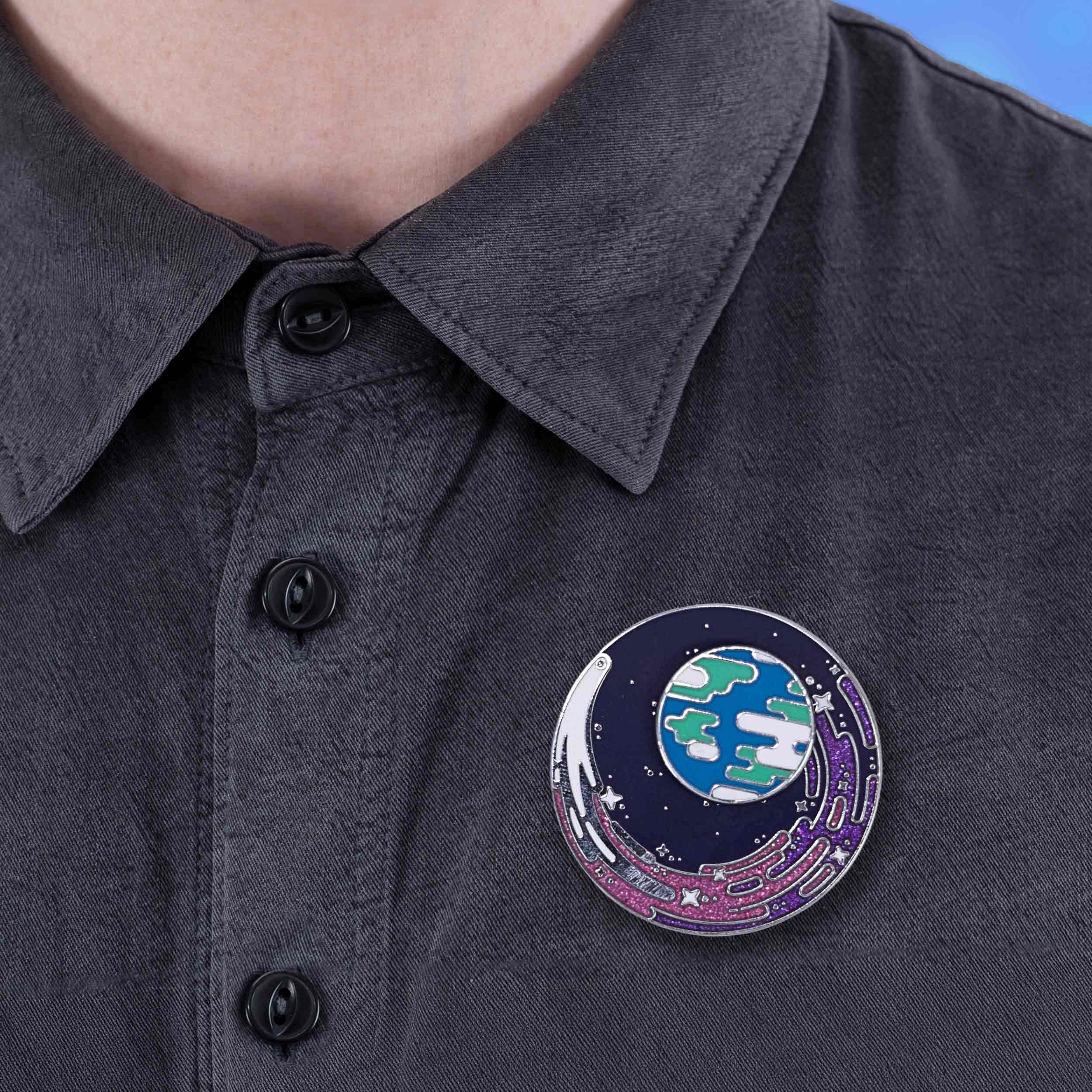 After months of designing, sampling, and testing, we've created a mesmerizing pin that's as satisfying to fidget with as it is beautiful to wear. The Earth and backing plate stays firmly put, while the comet spins freely.