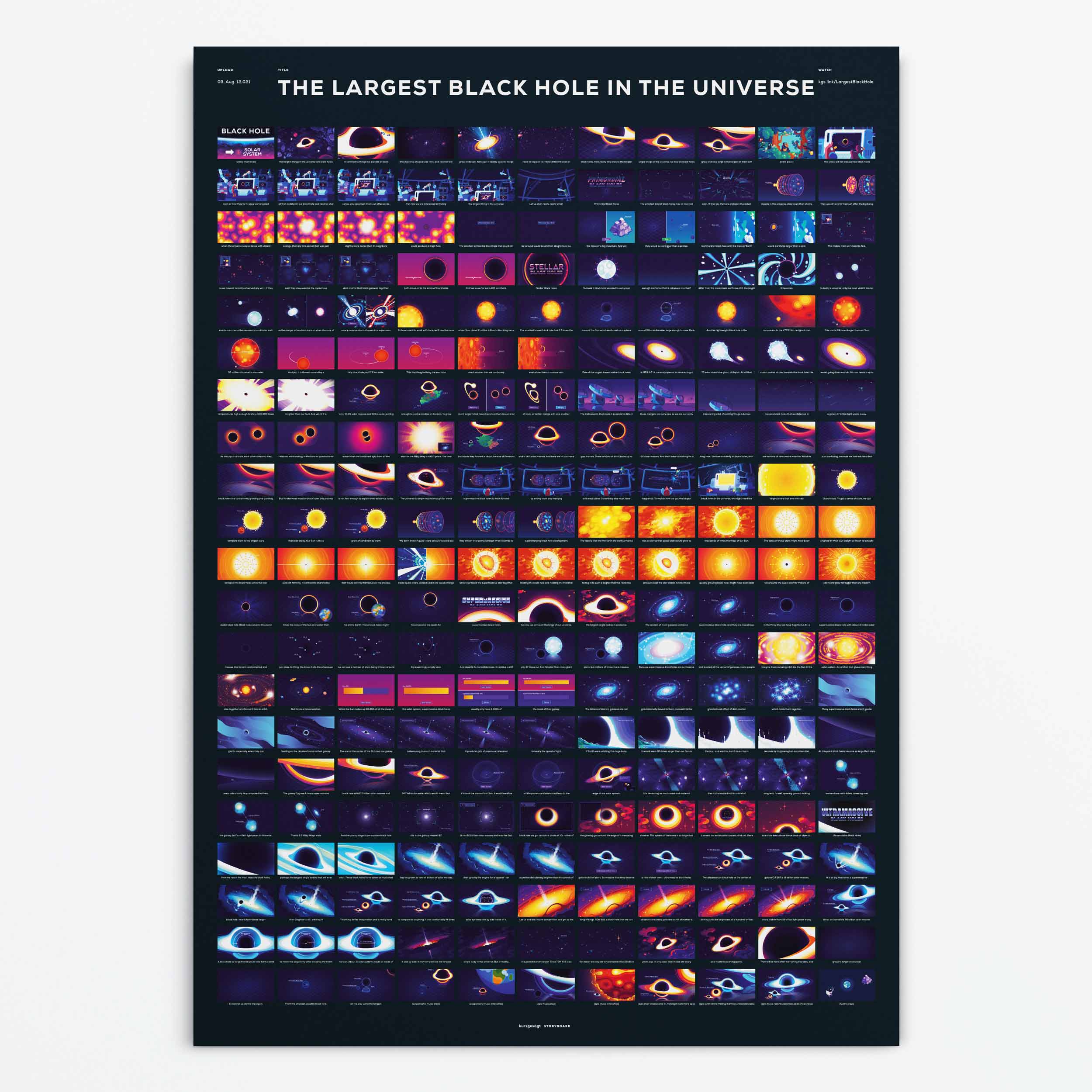 This poster is based on our video: "The Largest Black Hole in the Universe", condensing each key scene and script line into one epic, visual journey for your walls.